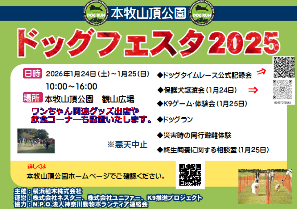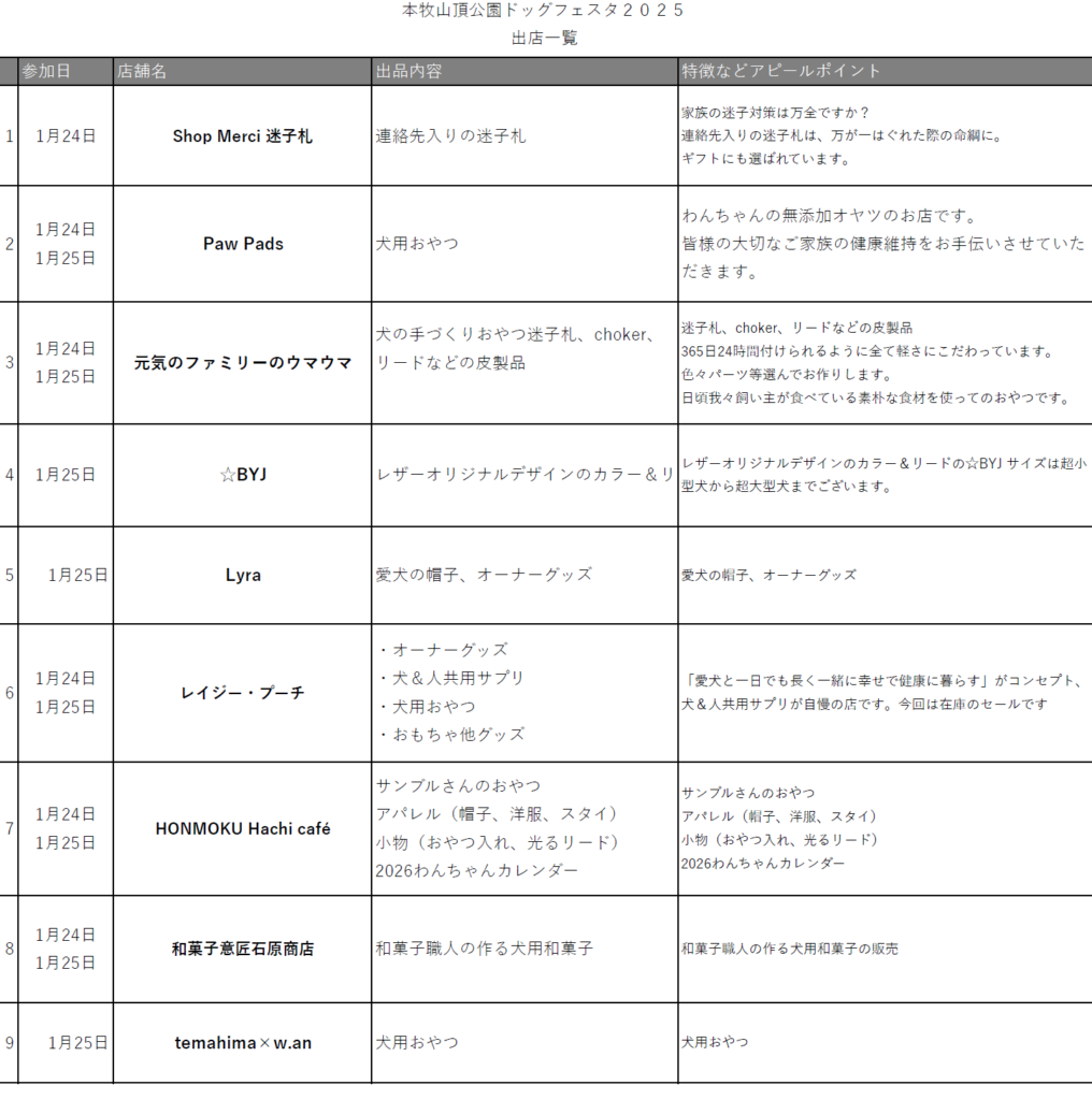 本牧山頂公園ドッグフェスタ2025のご案内 2026.01.22 情報が入り次第更新してまいります。 エリアマップになります。 出店店舗が確定いたしました!! 1月24日(土)のスケジュールになります。 1月25日(日)のスケジュールになります。