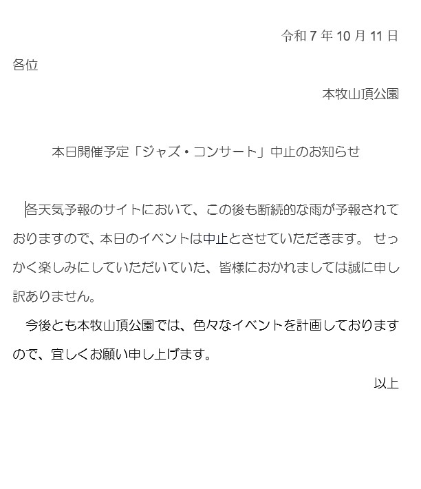 ホーム 公園だより JAZZコンサート 中止のお知らせ