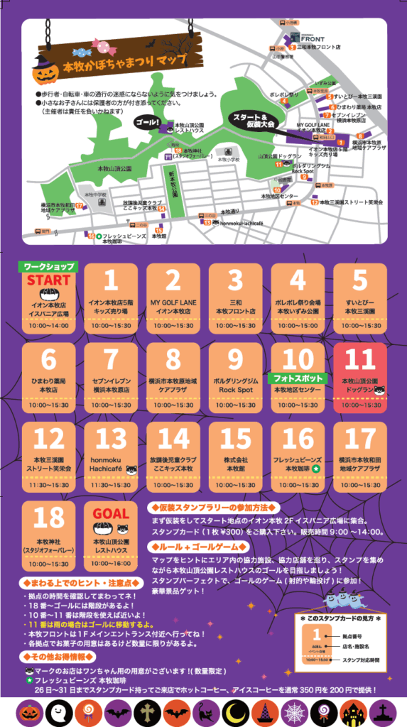10月25日は本牧かぼちゃまつりを実施いたします。 2025.10.23 イベント 本牧山頂公園レストハウスがゴールになります。又本牧山頂公園ドッグランもスタンプ拠点として参加いたします。(雨天の場合はゴールに移動いたします。 参加方法はイオン本牧イスパニア広場でスタンプカードをを300円で購入し仮装をして頂き 各拠点を周りスタンプを全部集めていただくと ゴールで射的、輪投げを体験し景品をゲットしていただけます。